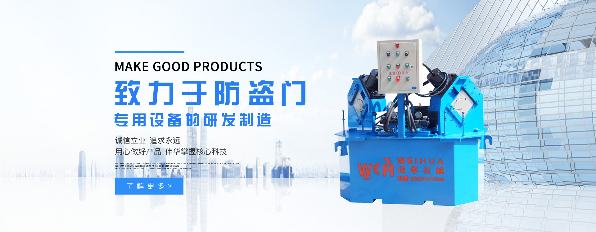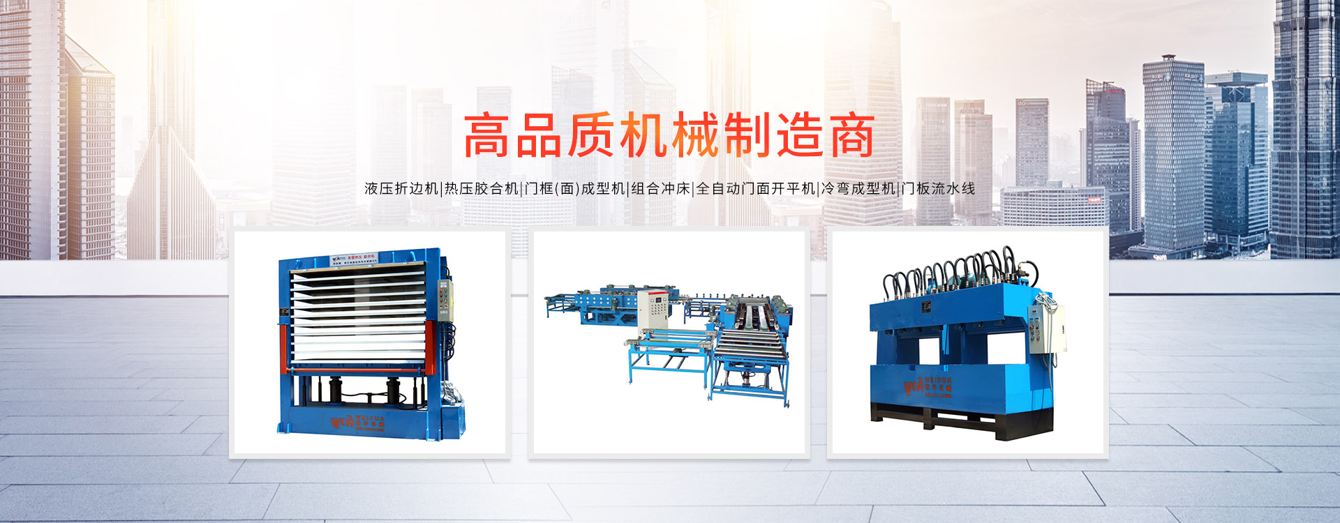 更多>溫州偉華機(jī)械制造有限公司地處浙江溫州瑞安市塘下工業(yè)區(qū),創(chuàng)建于2009年,數(shù)年來全心致力于防盜門專用設(shè)備的研發(fā)制造,主營產(chǎn)品有:門面成型機(jī)、門框成型機(jī)、熱壓膠合機(jī)、組合沖床、液壓折邊機(jī)、雙頭沖床、門面開平機(jī)。現(xiàn)已具備獨(dú)特的管理模式和產(chǎn)品開發(fā)能力,歷經(jīng)多年的努力,現(xiàn)已發(fā)展成為國內(nèi)最具影響力的機(jī)械設(shè)備企業(yè)之一。